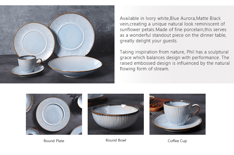 아이보리 화이트, 블루 오로라, 무광택 블랙 정맥으로 제공되어 해바라기 꽃잎을 연상시키는 독특하고 자연스러운 모습을 연출합니다. 고급 도자기로 제작되어 식탁에서 눈에 띄는 훌륭한 작품으로 손님을 크게 기쁘게 합니다.자연에서 영감을 얻은 Phil은 디자인과 성능의 균형을 이루는 조각 같은 우아함을 가지고 있습니다.융기된 엠보싱 디자인은 자연스럽게 흐르는 물줄기의 영향을 받았습니다.